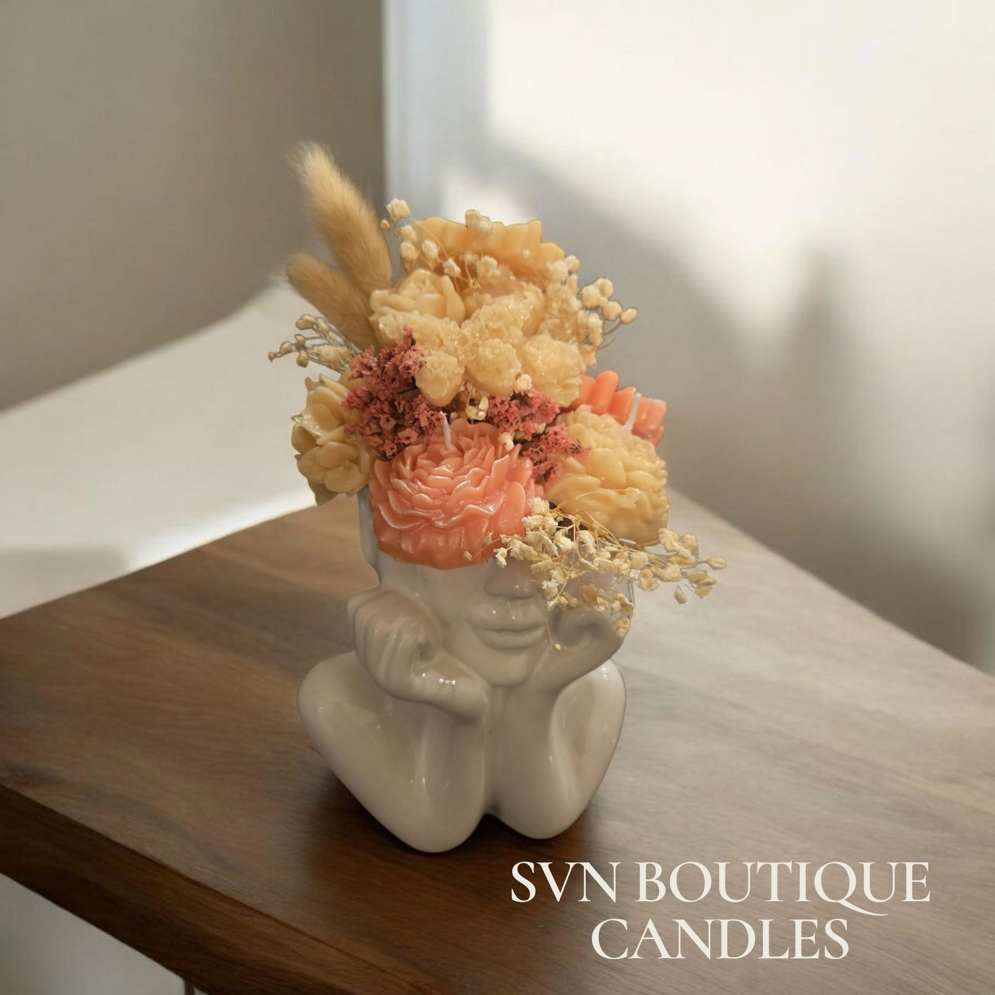 Arreglo floral artesanal de cera de primera calidad. Una pieza decorativa única que combina delicadas flores de cera en tonos melocotón y beige con toques naturales secos. Perfecto como regalo o un toque sofisticado para tu hogar.