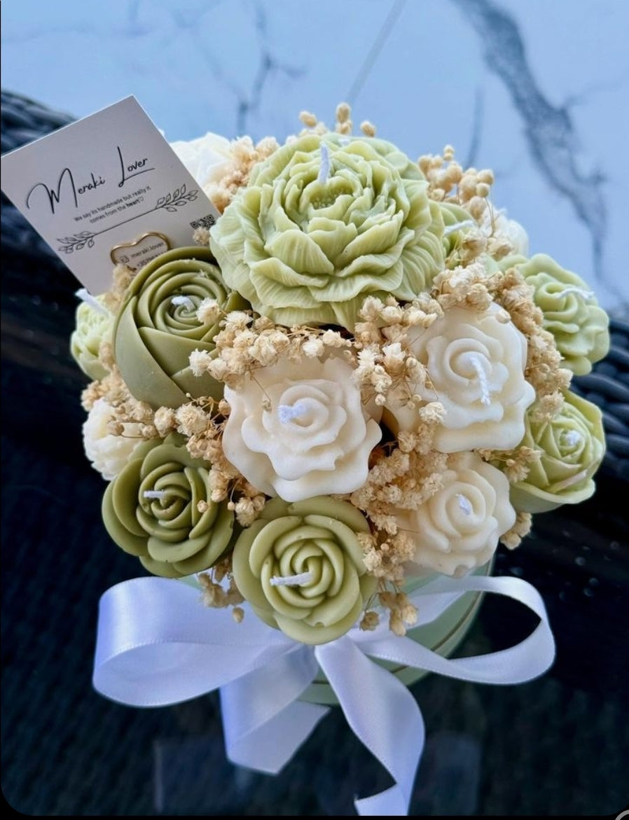 A floral-themed candle arrangement crafted to resemble a bouquet. The piece features intricately molded candles shaped like roses and a large central peony in soft green and ivory tones. White wicks are visible on each candle flower. The bouquet is accented with sprigs of dried baby’s breath and tied with a wide satin white ribbon, giving it an elegant gift-like presentation. A branded card is tucked inside, enhancing its display as a decorative or gifting item.