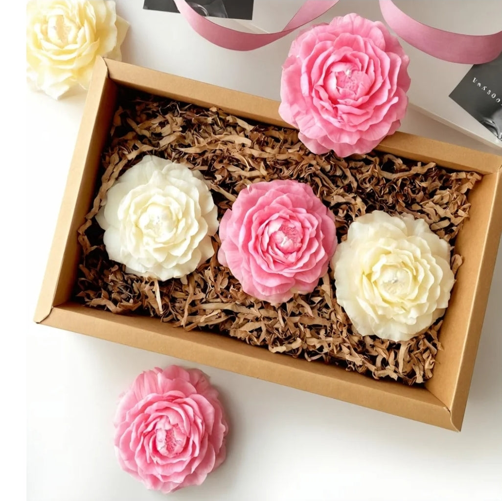 A gift box containing intricately crafted flower-shaped candles. The candles are designed to resemble blooming peonies or roses, in soft shades of white and pink. They rest on a bed of shredded brown paper filler inside a kraft box, giving a natural and elegant presentation. Additional candles are placed outside the box for display, highlighting the realistic floral detailing. This setup is ideal for gifting or decorative use.