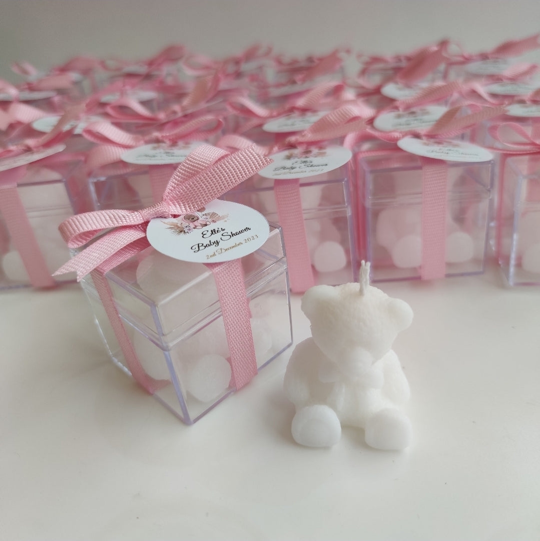 “A sweet way to thank your guests and celebrate your little one. Our Teddy Glow Favor Candles are hand-poured in creamy white wax and shaped into a darling teddy bear. Each candle is presented in a clear gift box, tied with a soft pink ribbon and custom tag—perfect for baby showers, gender reveals, or first birthdays. A charming keepsake that captures the joy of welcoming a new life.”