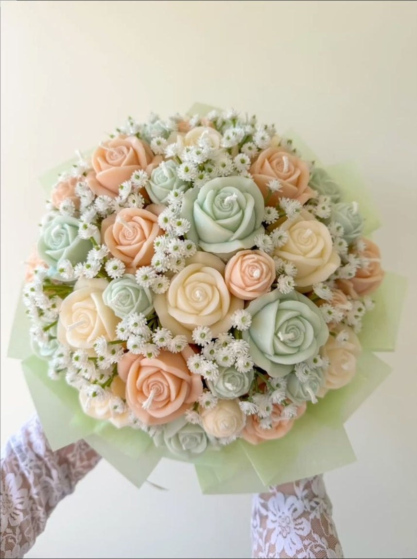 A beautifully arranged bouquet made of flower-shaped candles designed to look like real roses. The candles come in pastel shades of peach, mint green, and ivory, each with a visible wick at the center. They are interspersed with small white artificial daisy-like fillers, enhancing the realistic floral look. The bouquet is wrapped in soft green translucent paper and presented elegantly, held by someone wearing lace sleeves. It combines artistry and practicality, serving as both decoration and functional candles.