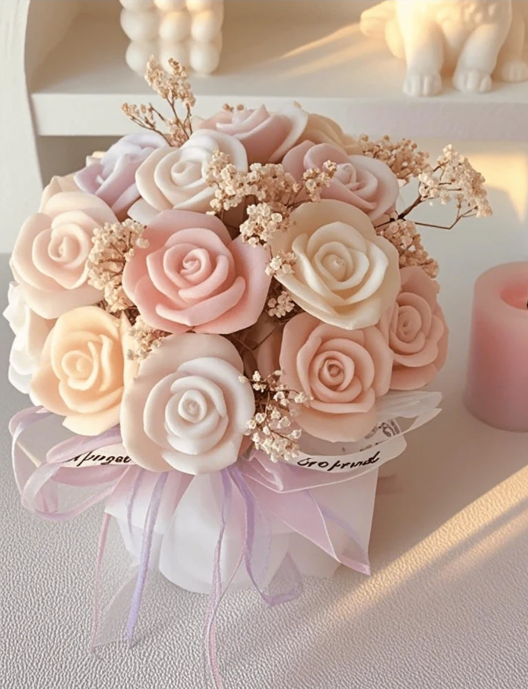 A decorative bouquet arranged in a round white container. It features pastel-colored roses in shades of blush pink, cream, and ivory, accented with delicate sprigs of dried baby’s breath. The arrangement is tied with soft, translucent ribbons in light pink and lavender, adding a delicate, elegant touch. The overall look is romantic and refined, ideal as a gift or for home décor.